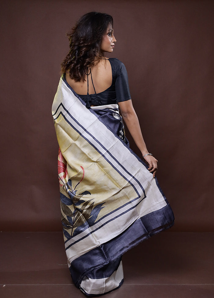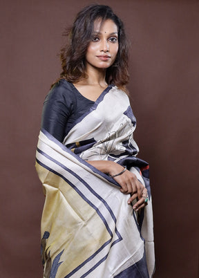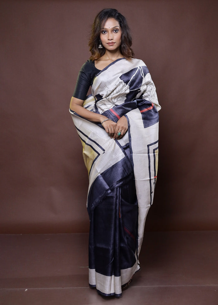 Cream Handloom Tussar Pure Silk Saree With Blouse Piece