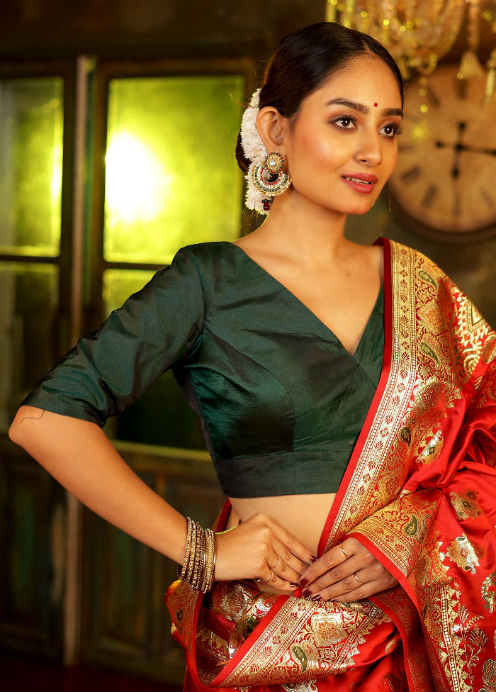 Adorn yourself with confidence and charm with the timeless grace of this beautiful blouse. Presenting, green color blended silk padded designer blouse. The best part of this blouse is its v neck work. The body of this blouse has elbow sleeves and v neckshape with overlapped pattern. Features with back hook closure.